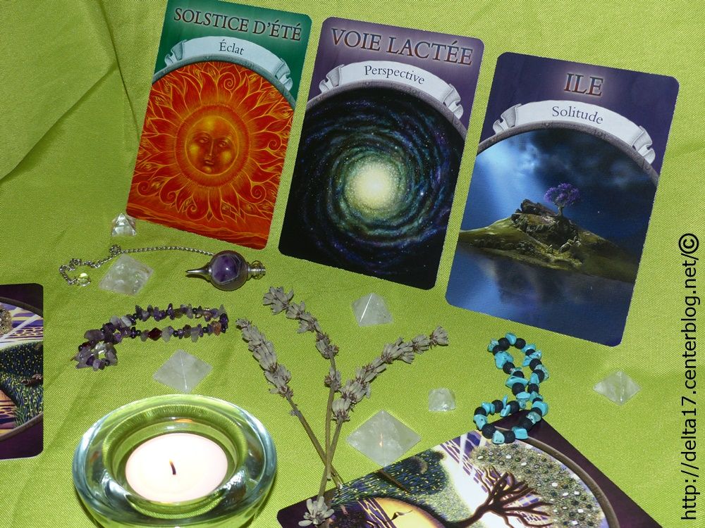 concernant le tirage de 3 cartes que j'ai effectué représente le solstice d'été qui est le soleil, la voie lactée qui représente l'univers et en son coeur le soleil et enfin l'ile où le soleil commence à percer à travers des nuages sombres pour illuminer la terre qui jusqu'à présent c'était reposée et ressourcée.